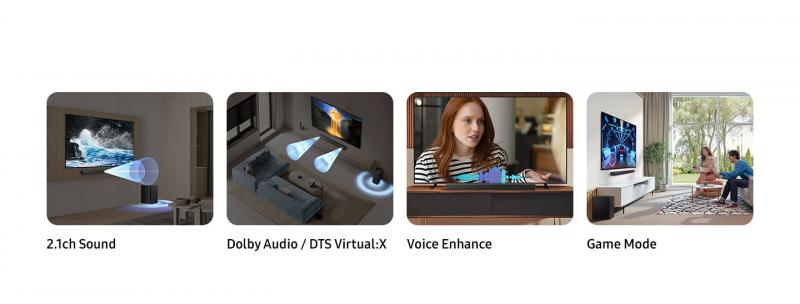 Enhance your listening experience with a complete 2.1ch sound system that includes a wireless subwoofer for deep, rich bass.