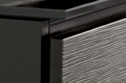 Lightly textured, black oak doors with black, tempered glass top and black oak finished side panels