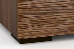 - Cabinet's center segment features an opening with a removable grille designed to hide a speaker